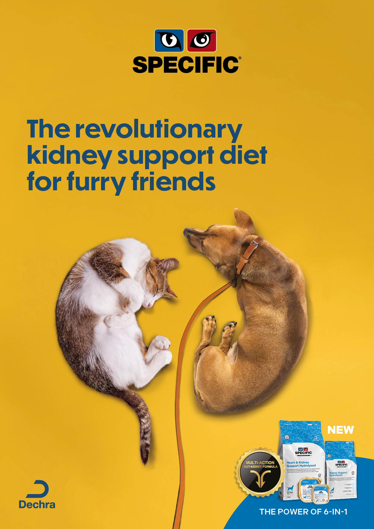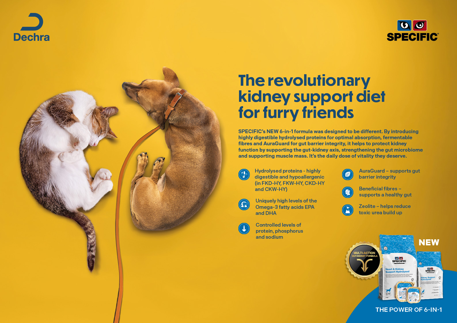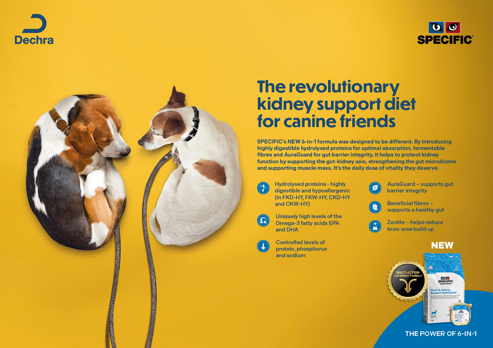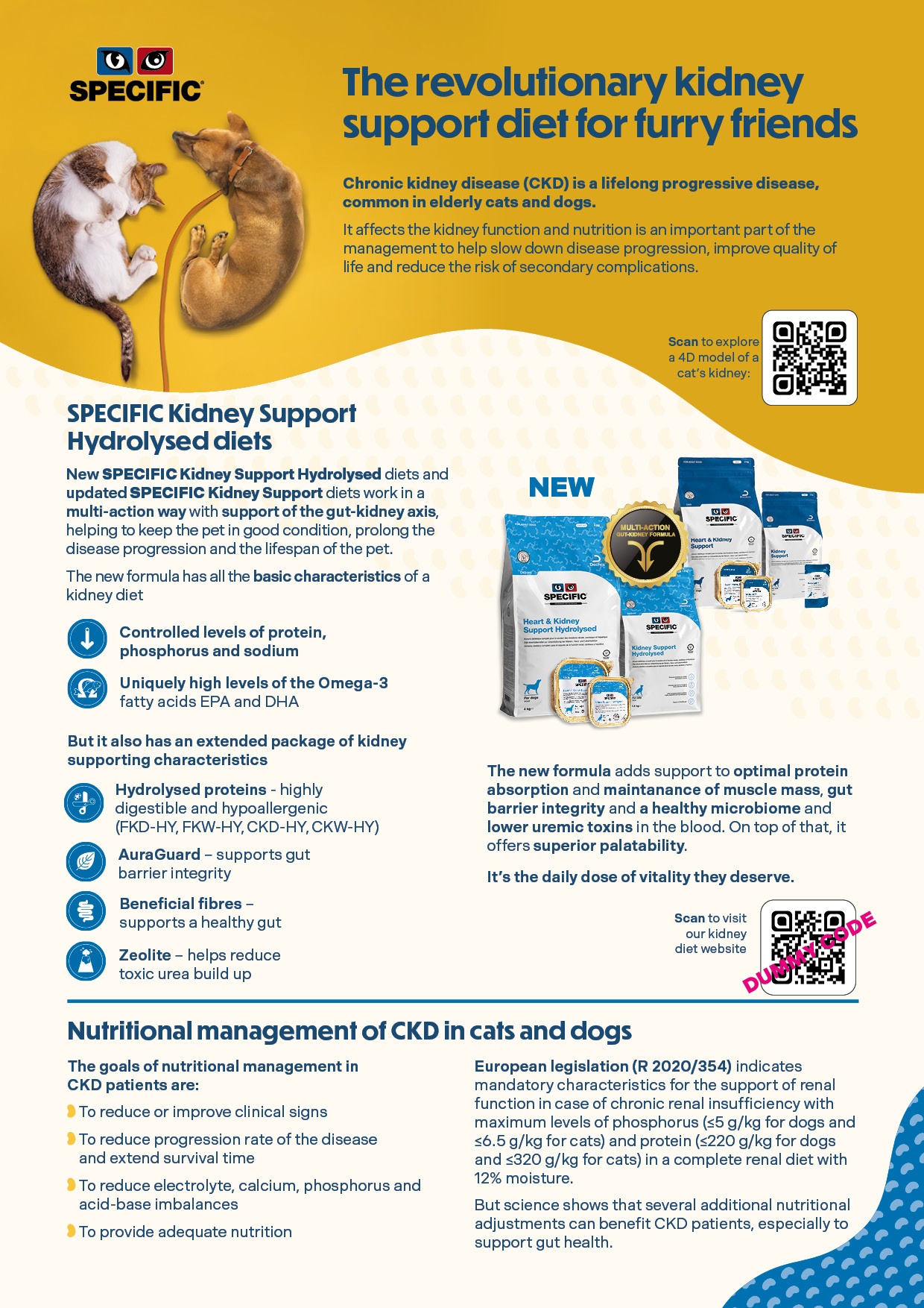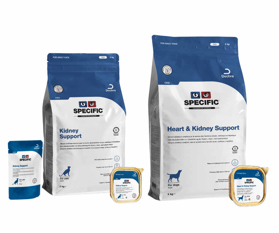 Nya SPECIFIC (Heart &) Kidney Support Hydrolysed och uppdaterade SPECIFIC (Heart &) Kidney Support är multifunktionella njurdieter som stöder ”gut-kidney axis” och djurets välmående samt kan bidra till att bromsa njursjukdom och därmed öka livslängden.