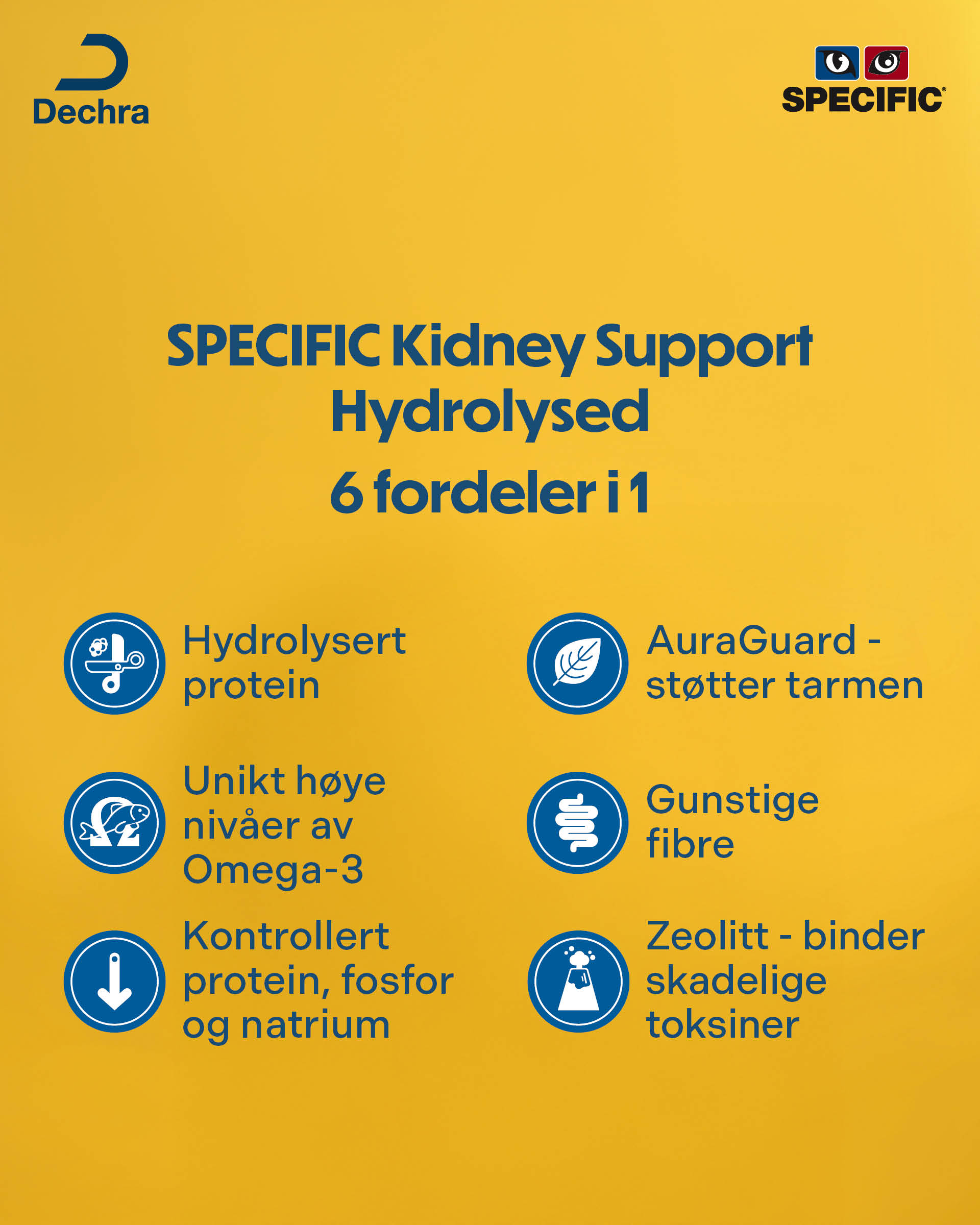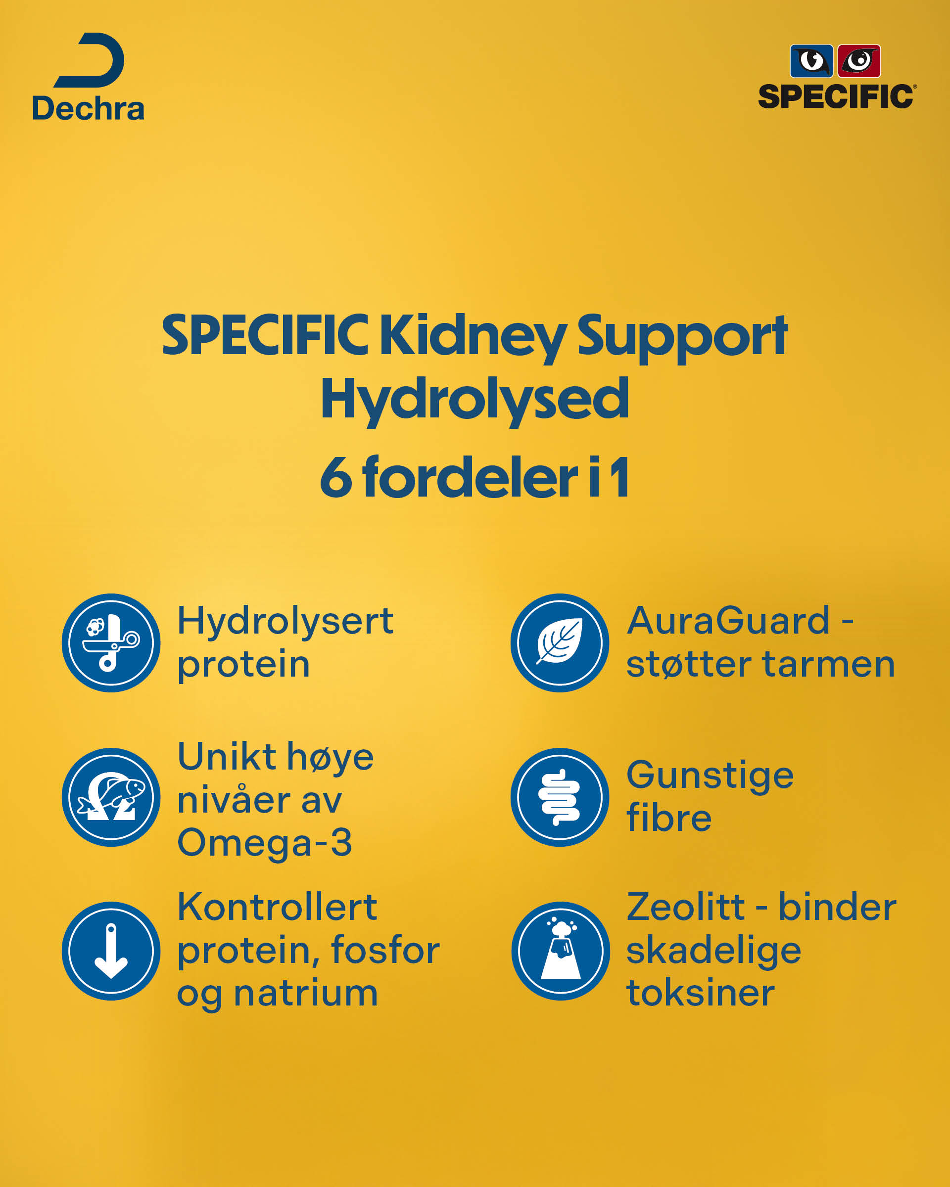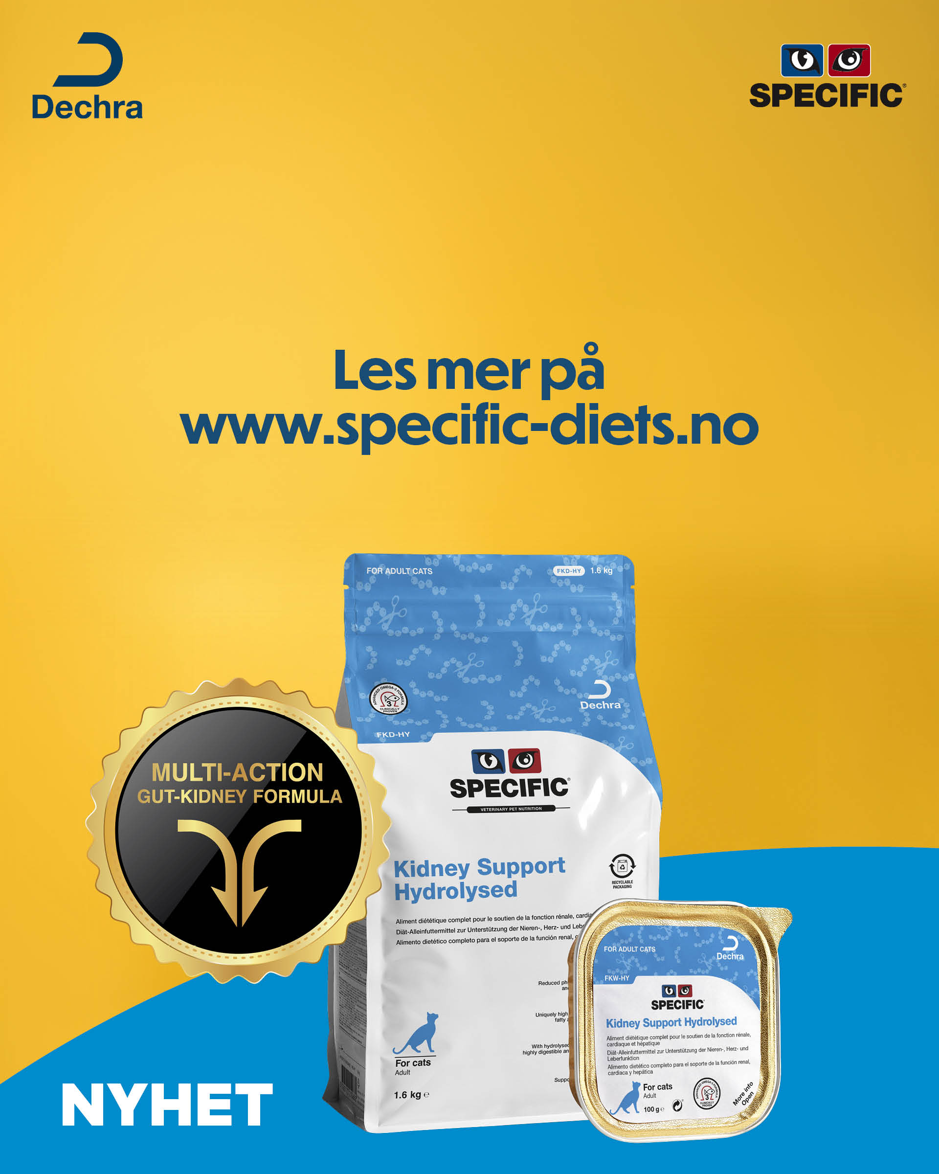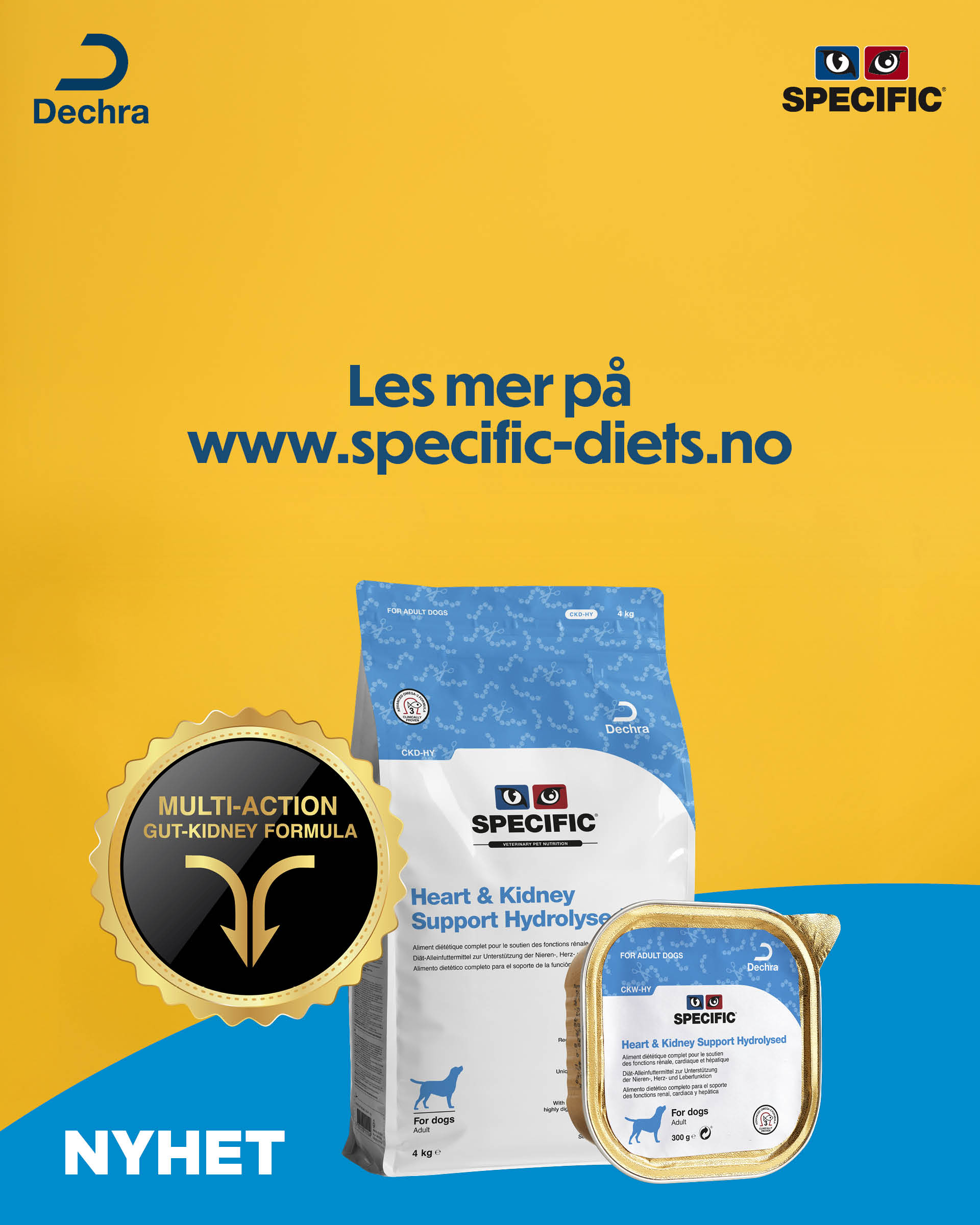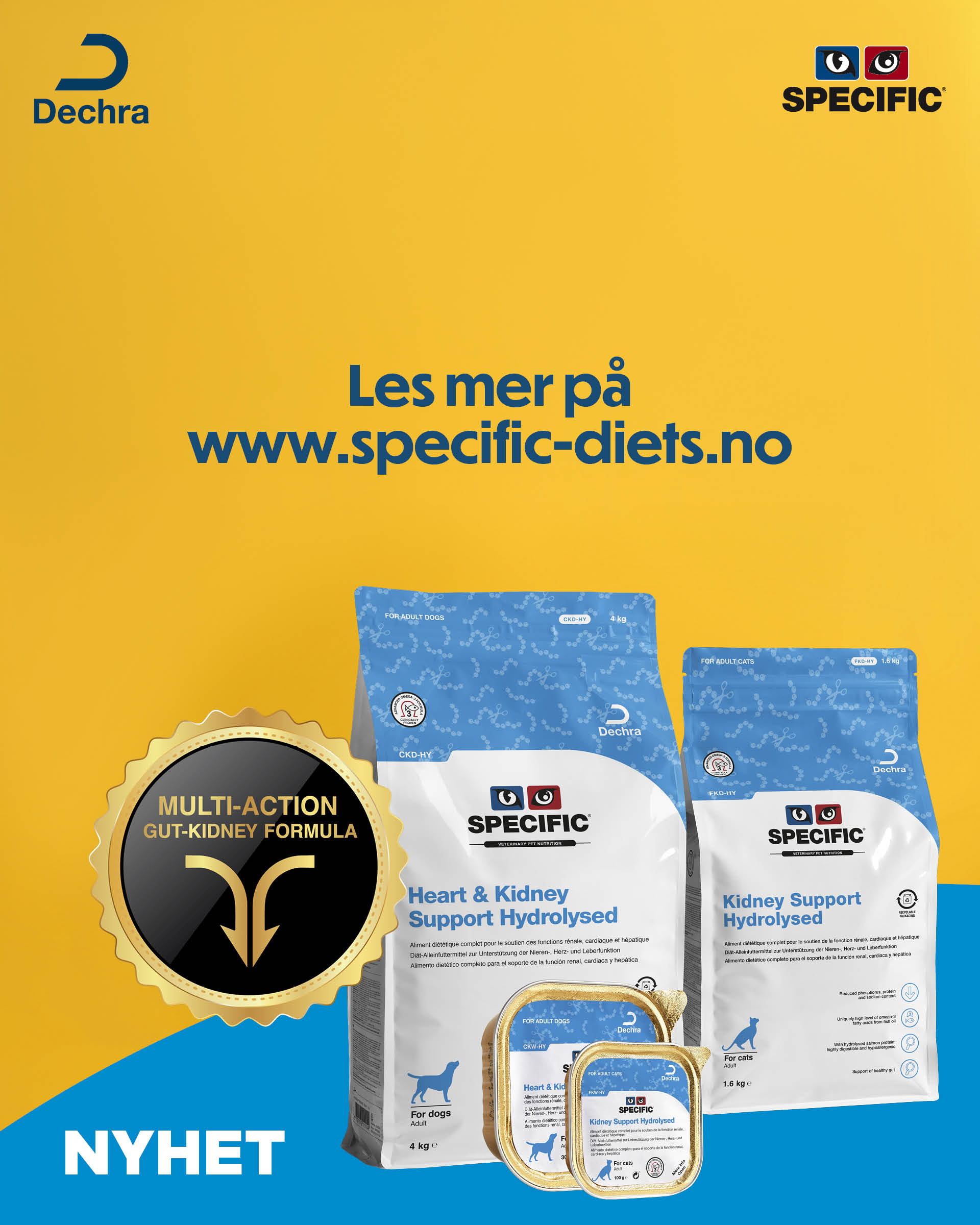 Nye SPECIFIC (Heart &) Kidney Support Hydrolysed og oppdaterte SPECIFIC (Heart &) Kidney Support er multifunksjonelle nyredietter som støtter ”gut-kidney axis” og dyrens helse, og kan bidra til å bremse nyresykdom og dermed øke forventet levealder.