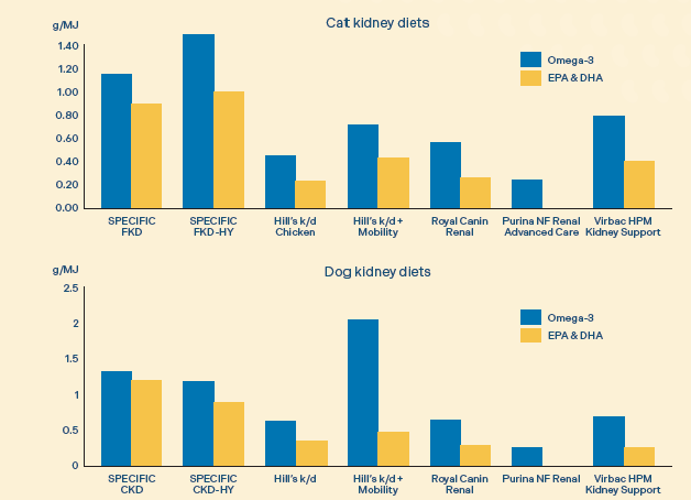 Veterinära njurdieter kompletteras ofta med höga koncentrationer av omega-3-fettsyror, men det är viktigt att komma ihåg att vegetabiliska källor till omega-3-fettsyror innehåller ALA (a-linolensyra) och inte EPA och DHA. ALA kan omvandlas till EPA och DHA med hjälp av enzymer i kroppen, men effekten av dessa enzymer är mycket låg hos hundar och nästan obefintlig hos katter. Endast omega-3 från marina källor har en hög halt av EPA och DHA. Därför är information om den specifika källan till och koncentrationen av omega-3 och EPA och DHA i kosten viktig för veterinärer och sköterskor.